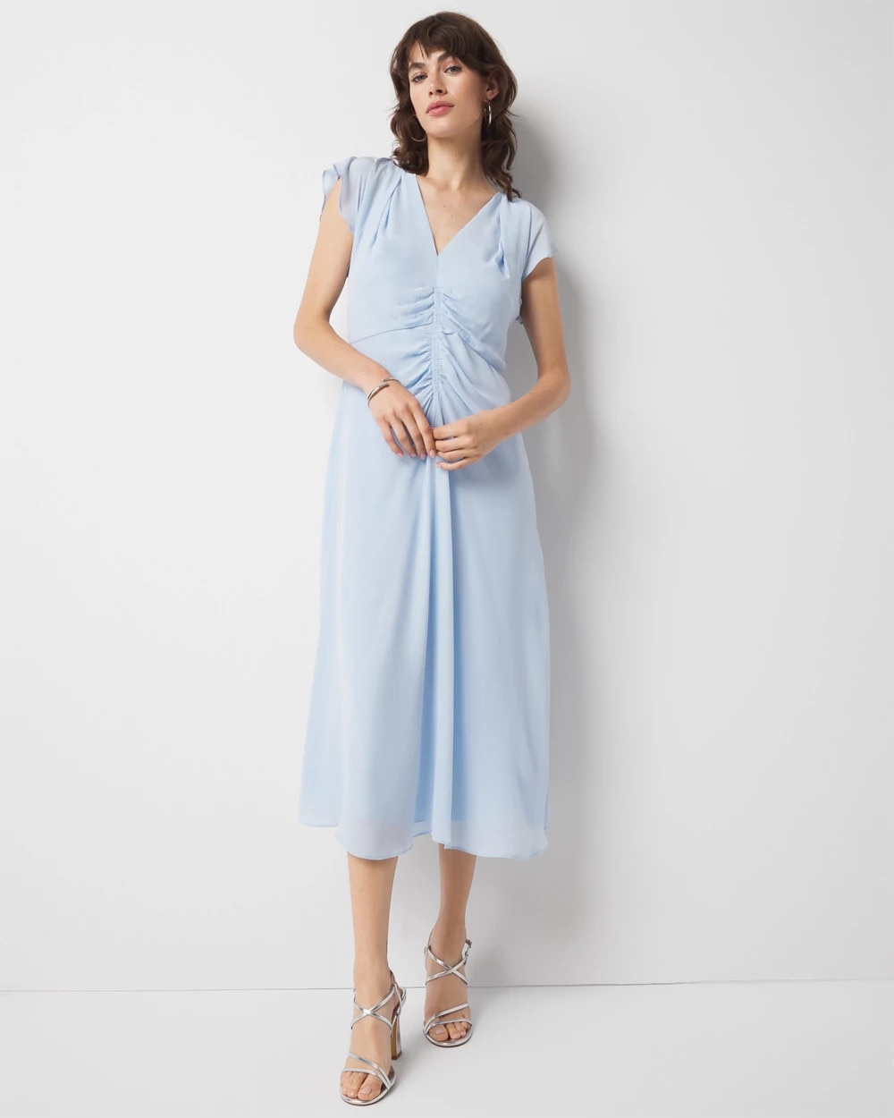 This midi dress has ruching down the front to flatter your shape and give you a perfect fit. The cap sleeves and V-neck are feminine touches that add up to this being an easy go anywhere dress for the season.