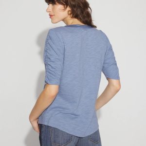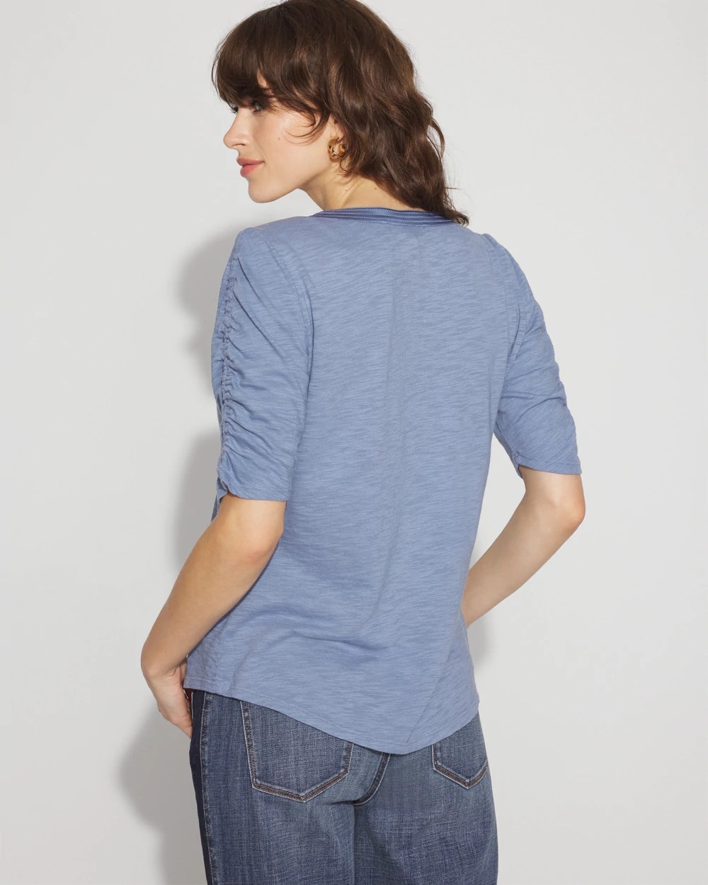 A classic cotton and modal slub tee gets a style update with ruched elbow sleeves and a notched neck. An easy, polished casual tee to pair with your favorite jeans.