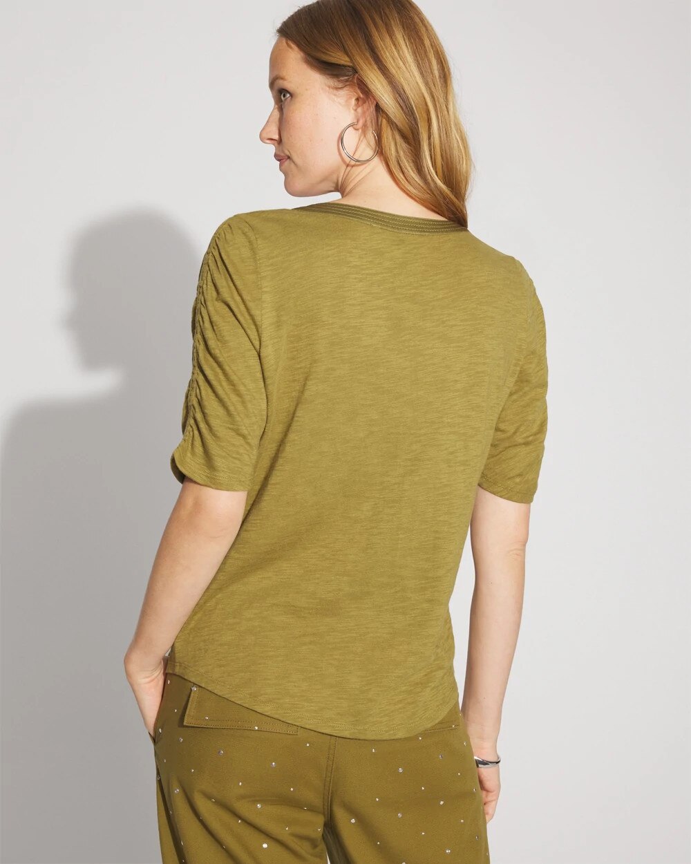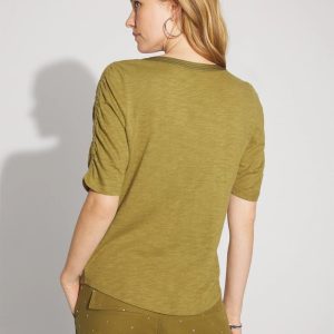 A classic cotton and modal slub tee gets a style update with ruched elbow sleeves and a notched neck. An easy, polished casual tee to pair with your favorite jeans.