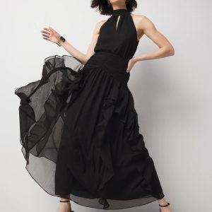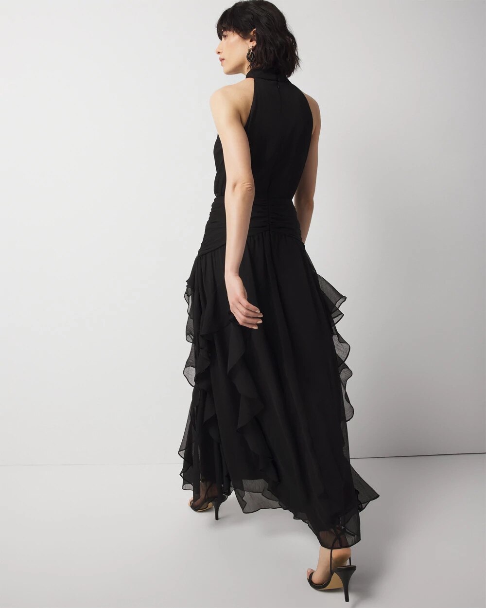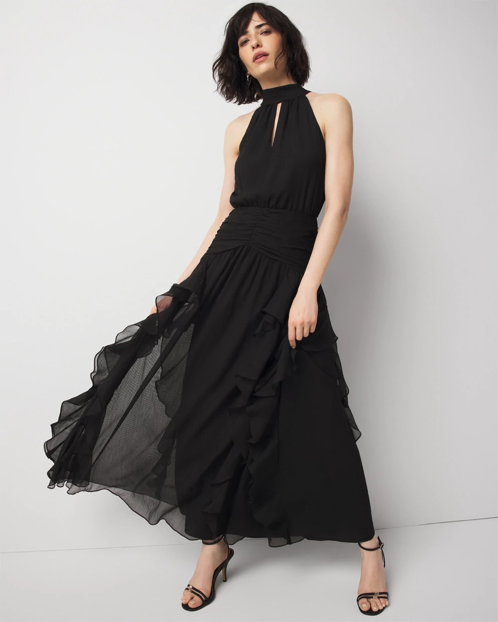 From the keyhole halter neckline to the cascading ruffles down the skirt, this flowy maxi dress has romance written all over it. We’ve designed it with shirring at the waist for a flattering fit. Wear with your favorite heels and strappy sandals.
