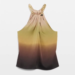 Dress up your denim for a night out with this flirty ombre satin halter top made from recycled polyester. A chunky chain does up at the back of the neck with a lobster closure. Chic + modern with jeans, black pants or shorts.