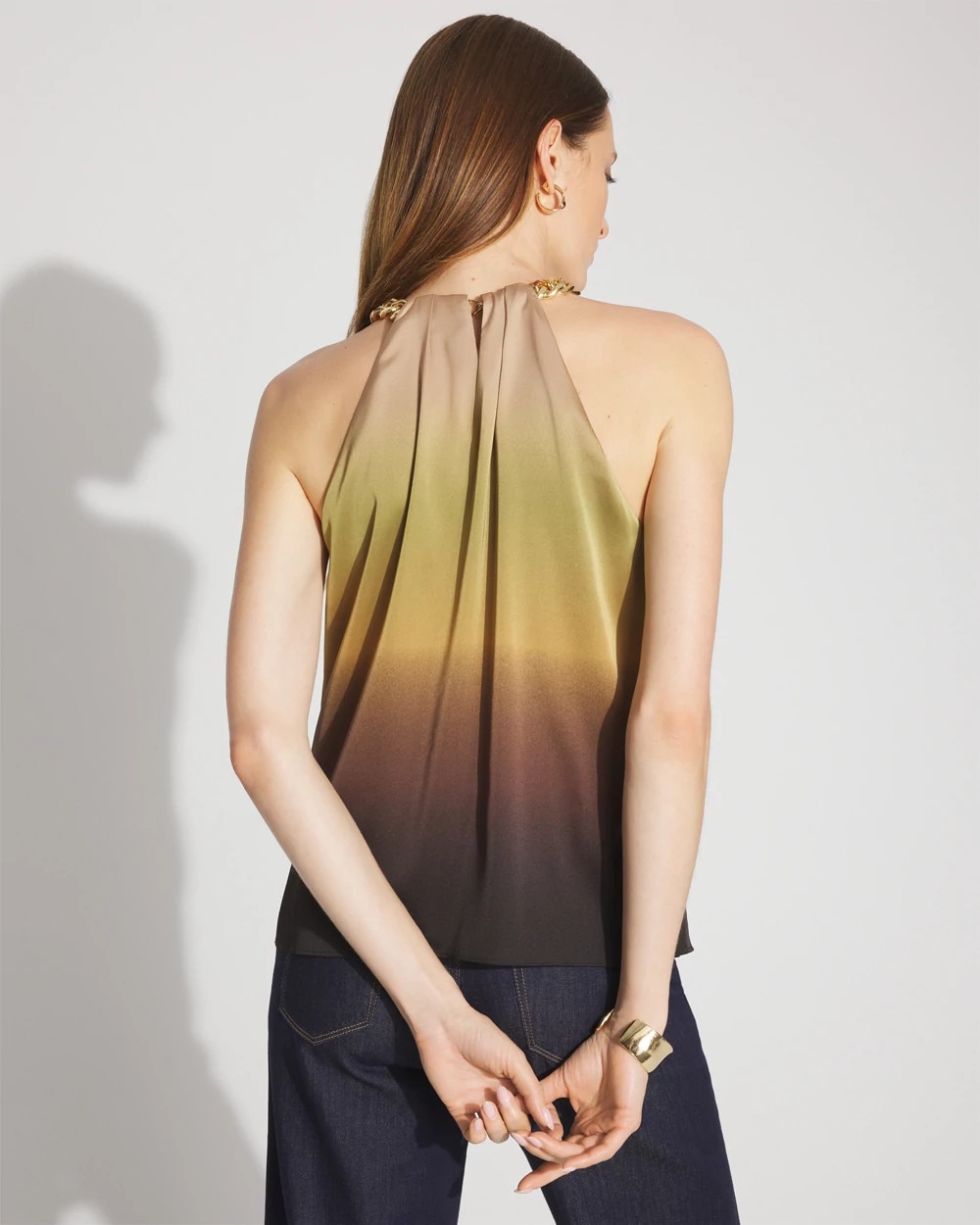 Dress up your denim for a night out with this flirty ombre satin halter top made from recycled polyester. A chunky chain does up at the back of the neck with a lobster closure. Chic + modern with jeans, black pants or shorts.
