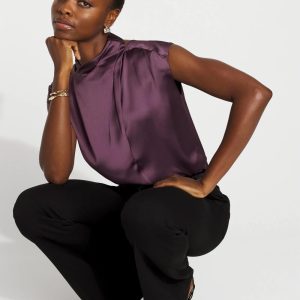 A twist detail at the neck and extended sleeve caps elevate this satin shell. The crewneck in front becomes an open back. A polished top that will becomes a work wardrobe staple.