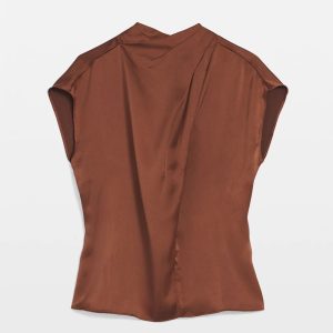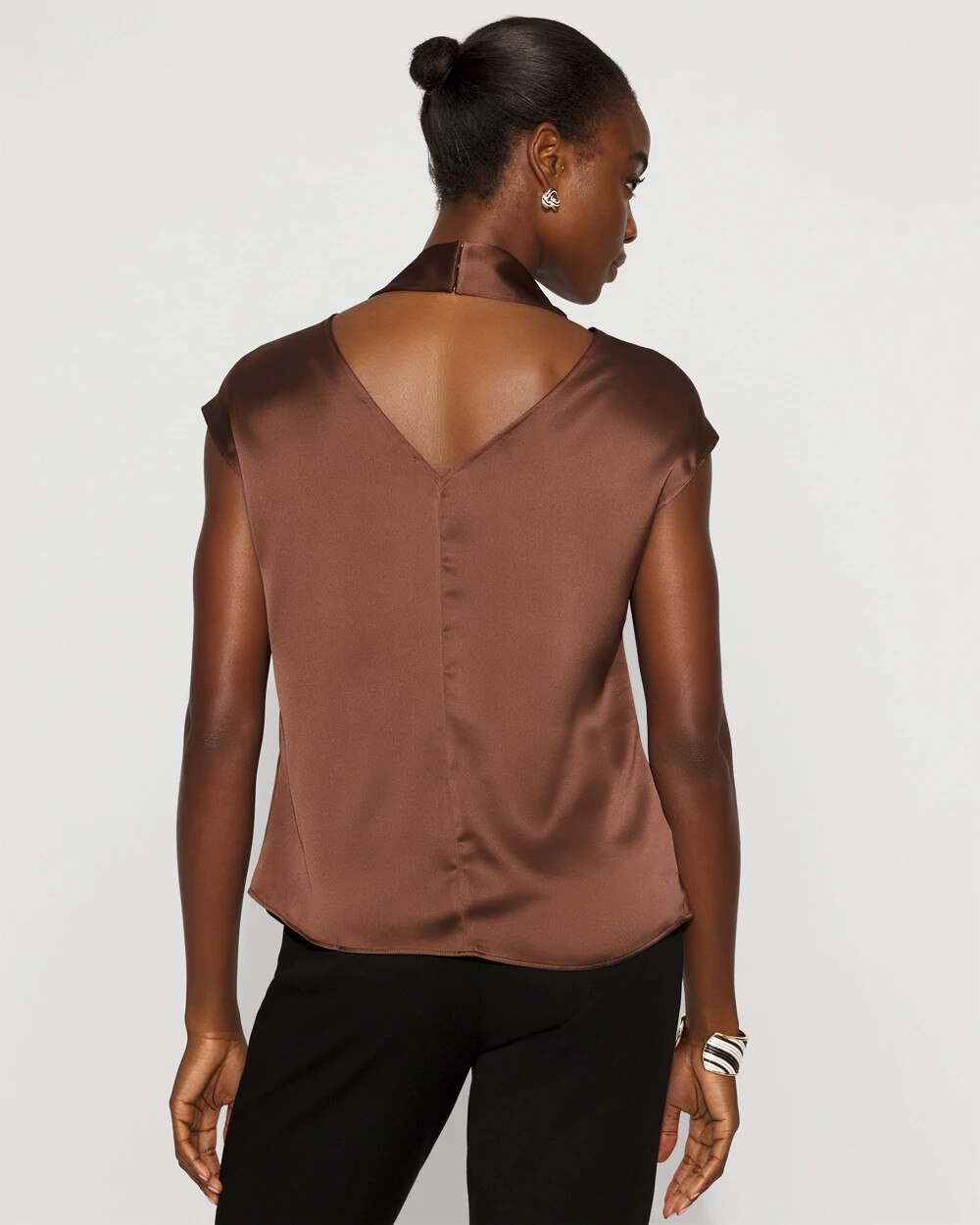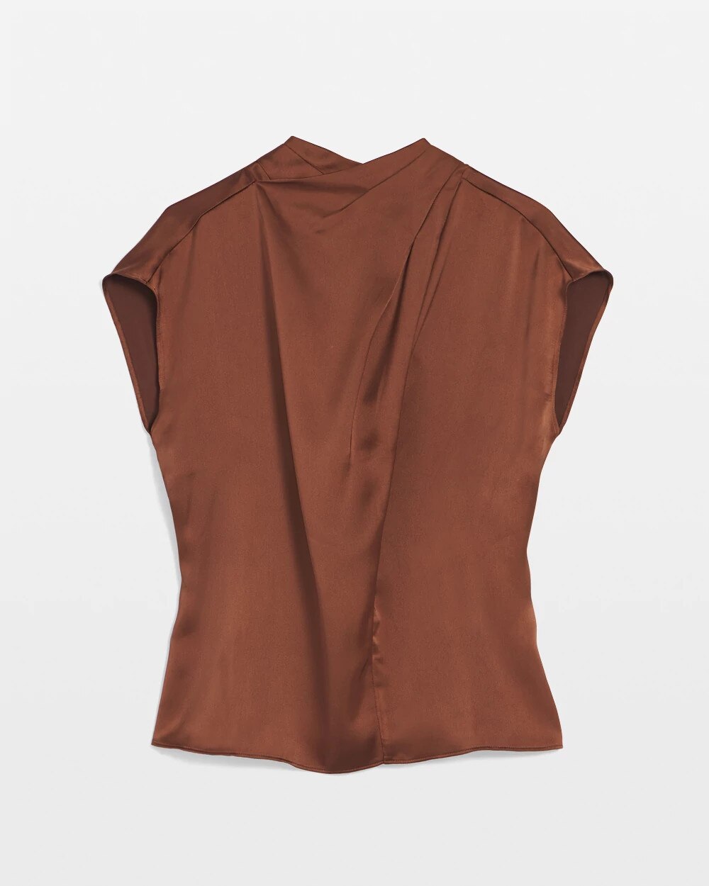 A twist detail at the neck and extended sleeve caps elevate this satin shell. The crewneck in front becomes an open back. A polished top that will becomes a work wardrobe staple.