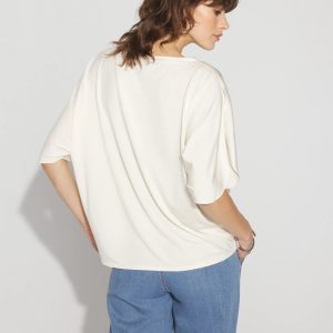 A satin front and jersey back give this top a sleek look and a comfortable + relaxed fit. The sleeves are split to bare some skin, and the neckline has a raw finish. An easy way to dress up denim.