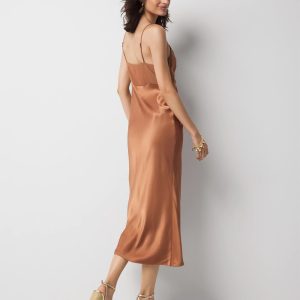 Wear this satin midi dress to your next social event. Designed with spaghetti straps, a chic sculptural metal piece in the center of the V-neck and a side slit, it’s a look that’s ready for a party.