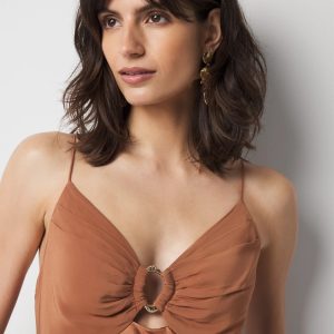 Wear this satin midi dress to your next social event. Designed with spaghetti straps, a chic sculptural metal piece in the center of the V-neck and a side slit, it’s a look that’s ready for a party.