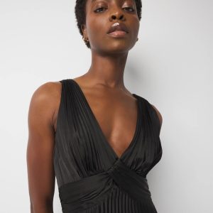Glam up for summer wedding season with this fully pleated dress that has a sexy crossover back with a cutout and a shark bite hem. Wear with strappy high heel shoes or sandals.