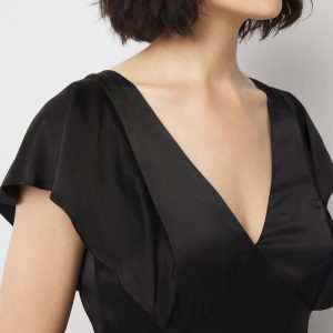 This satin slip dress is cut on the bias with a plunging V in front and back and flutter sleeves. Dressy, feminine and timeless, it’s an easy look for summer nights.