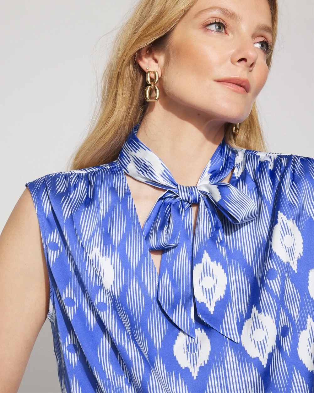 Your work wardrobe needs this. A satin shell designed with a surplice neckline that is anchored by a hook + eye, and a tie at the neck you can wear as you wish. An elastic waist creates a blouson style that will look fantastic with a skinny or slim leg pant or jean. Wear under a blazer or on its own.