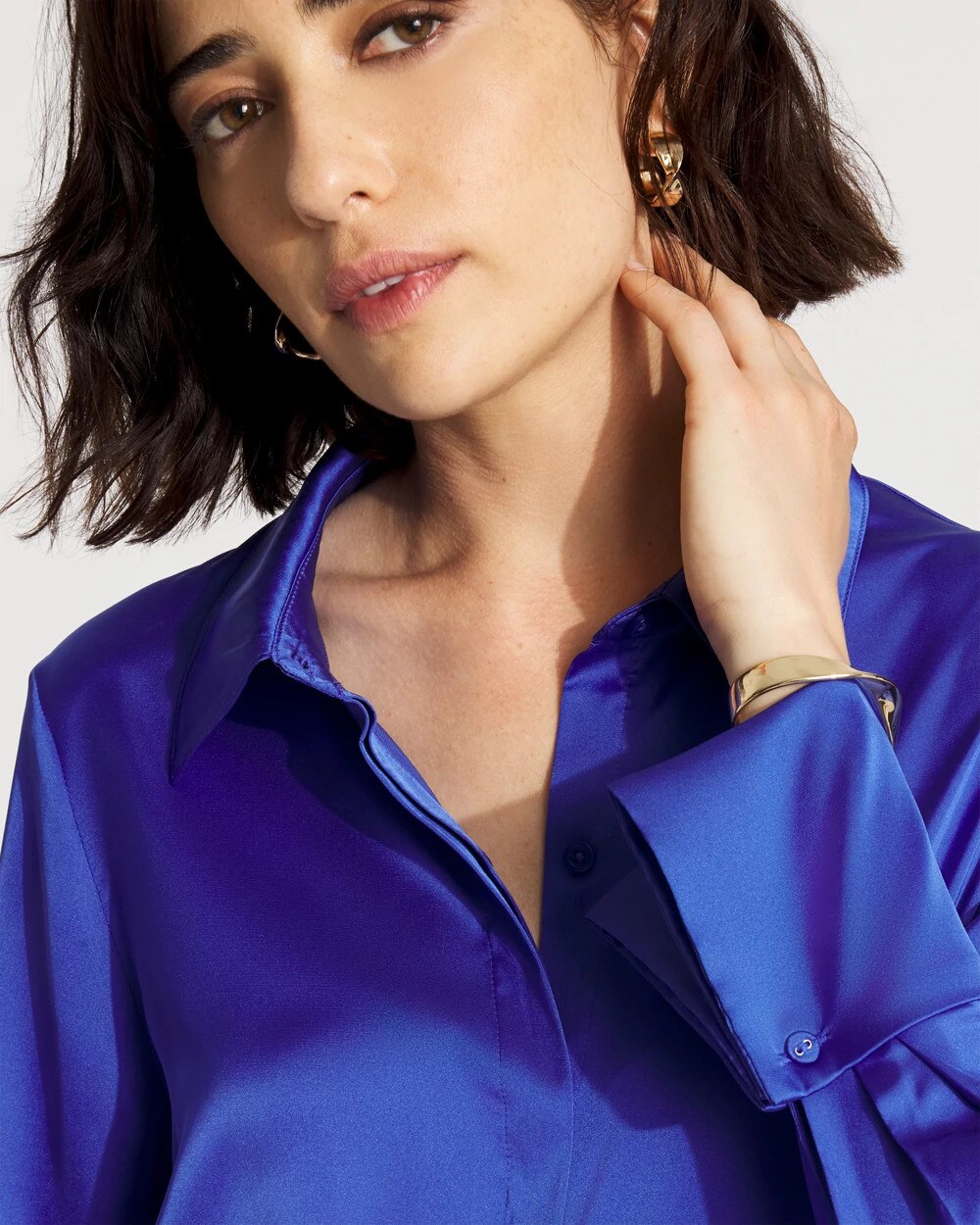 A tuxedo version of our bestselling Soft Shirt made from sleek satin and designed with French cuffs. We’ve tested it under jackets and blazers and it’s a perfect pairing. Hidden button closure and button cuffs.