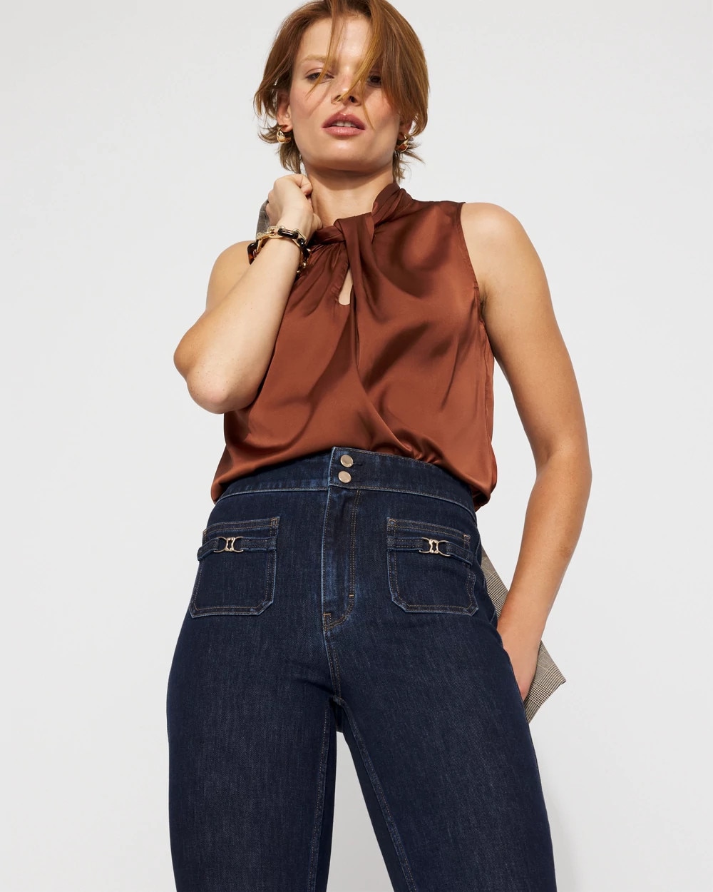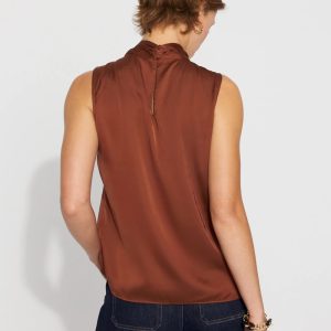 Our sleeveless shells are a workwear fan favorite; this latest edition is made from sleek satin with a twist neck detail. Wear this top under jackets and blazers for a polished look.