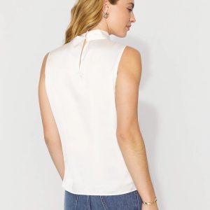 Our sleeveless shells are a workwear fan favorite; this latest edition is made from sleek satin with a twist neck detail. Wear this top under jackets and blazers for a polished look.