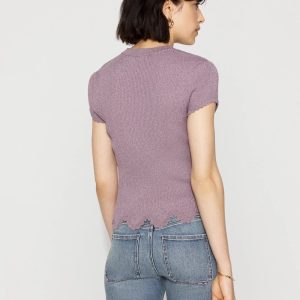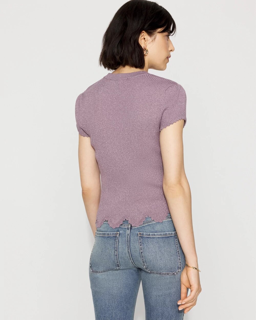 Knit from a metallic yarn for a chic shimmer, this short cap sleeve sweater has a scalloped hem and cuff, giving it a feminine + romantic look.