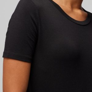 A great classic tee is a must in any wardrobe. This short-sleeve crewneck tee fills that need fabulously with its perfect fit and soft comfort. The fitted silhouette makes this short-sleeve tee flattering on its own with a pair of jeans or as a sleek, smooth layering piece under jackets and sweaters.