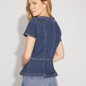 Hammered silver buttons elevate the front of this scoop neck, stretchy denim jacket. And a peplum hem slightly flares at the waist to give you an hourglass shape. For a chic denim-on-denim look pair this jacket with our matching Extra High-Rise Wide-Leg Trouser Jean