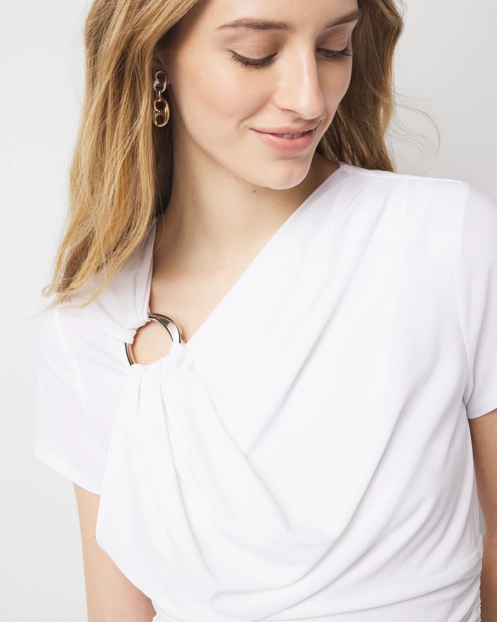 This fashion forward matte jersey top is designed with metal hardware detail at the draped neckline that evokes the best of 70s fashion as well as side seam shirring to create a luxe look. Pair with a pencil skirt or slim jeans or pants.