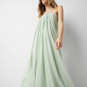 A timelessly chic silhouette, the strapless gown is draped throughout the body, eluding to old Hollywood glamour. The subtle sweetheart neckline calls for a shimmering necklace.