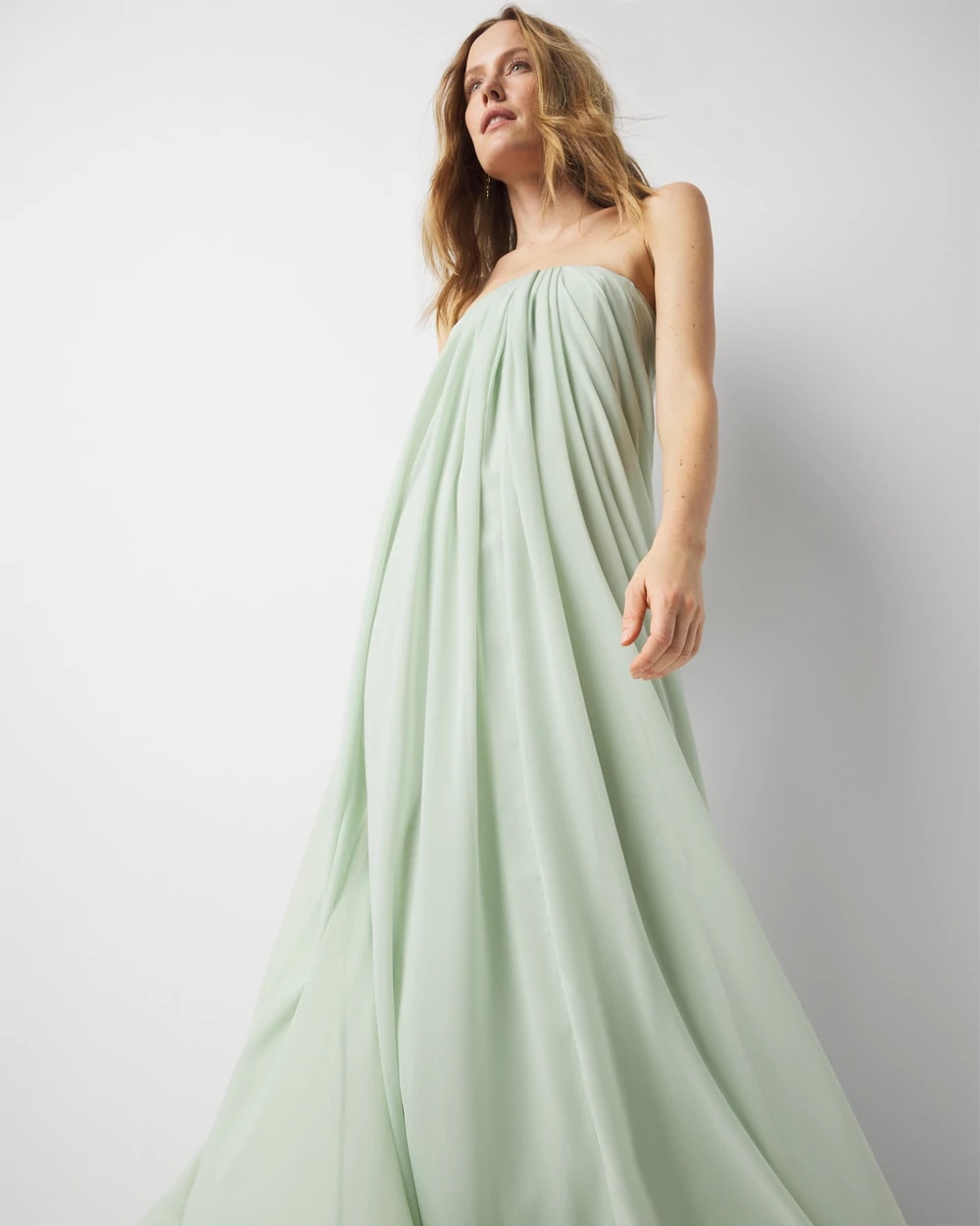 A timelessly chic silhouette, the strapless gown is draped throughout the body, eluding to old Hollywood glamour. The subtle sweetheart neckline calls for a shimmering necklace.