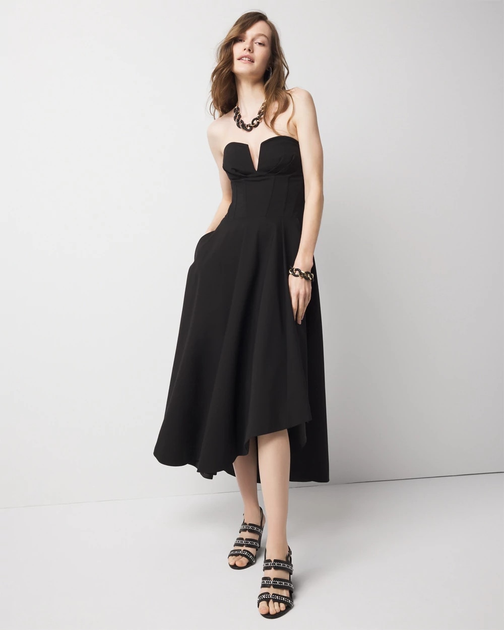 Summer parties or vacation getaways call for a special dress. This strapless corset midi is the formal dress you’re looking for. Cut from a cotton-blend poplin, this dress has a deep V-neckline, corset details in front, a dramatic full skirt with asymmetric hem plus pockets to stash your essentials. The bodice has boning and gripper tape for structure and hold.