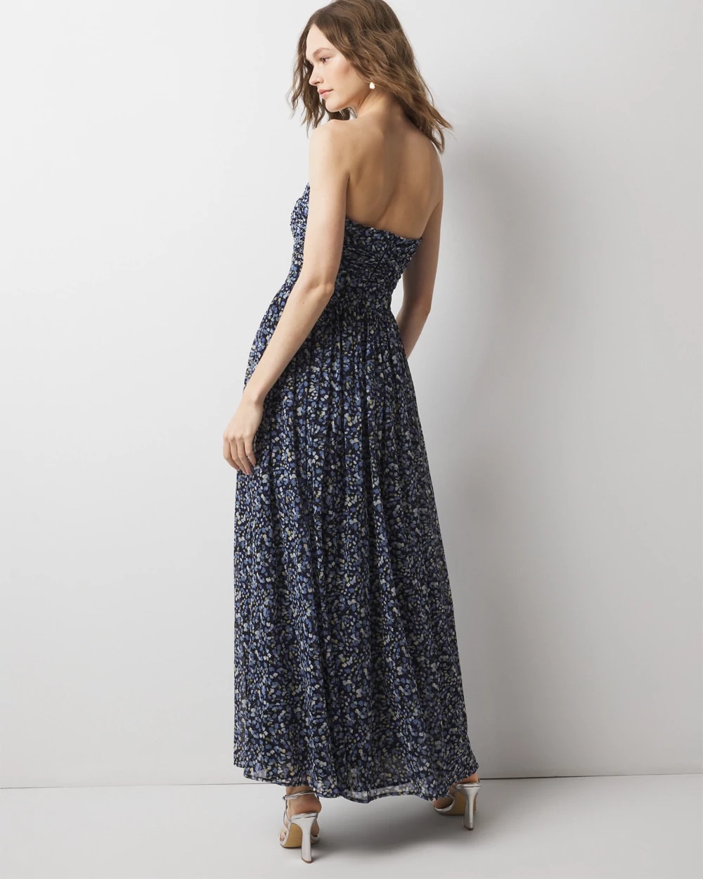 Our mesh fabrics are soft, cool, and fully lined. The ruching on this strapless maxi dress create an ultra-feminine silhouette that will take you anywhere this season.