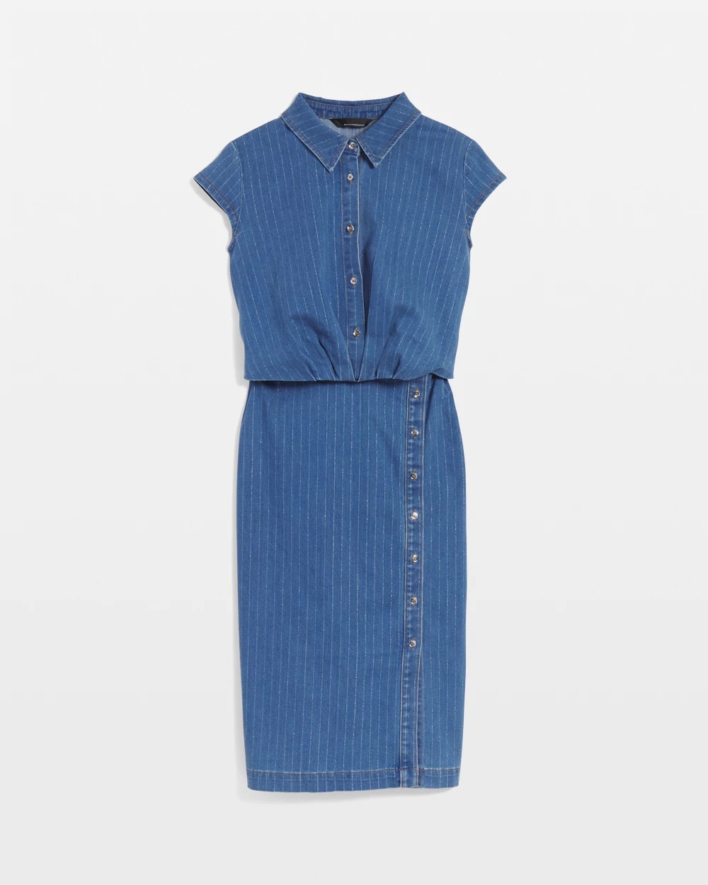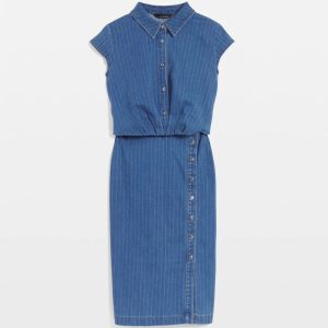 We’ve taken a classic sheath dress silhouette and updated it in denim. But not just any denim, we used a pinstriped lurex fabric as a subtle nod to the ongoing menswear trend. We also added two functional buttons at the top and a twist front detail to define the waist. A great look for the office or weekend brunch.