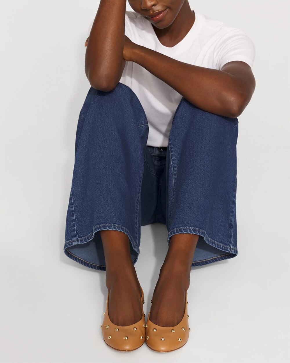 These faux leather ballet flats are embellished with gold studs for a touch of shine. An easy neutral shoe to wear with all your pants, jeans and dresses.