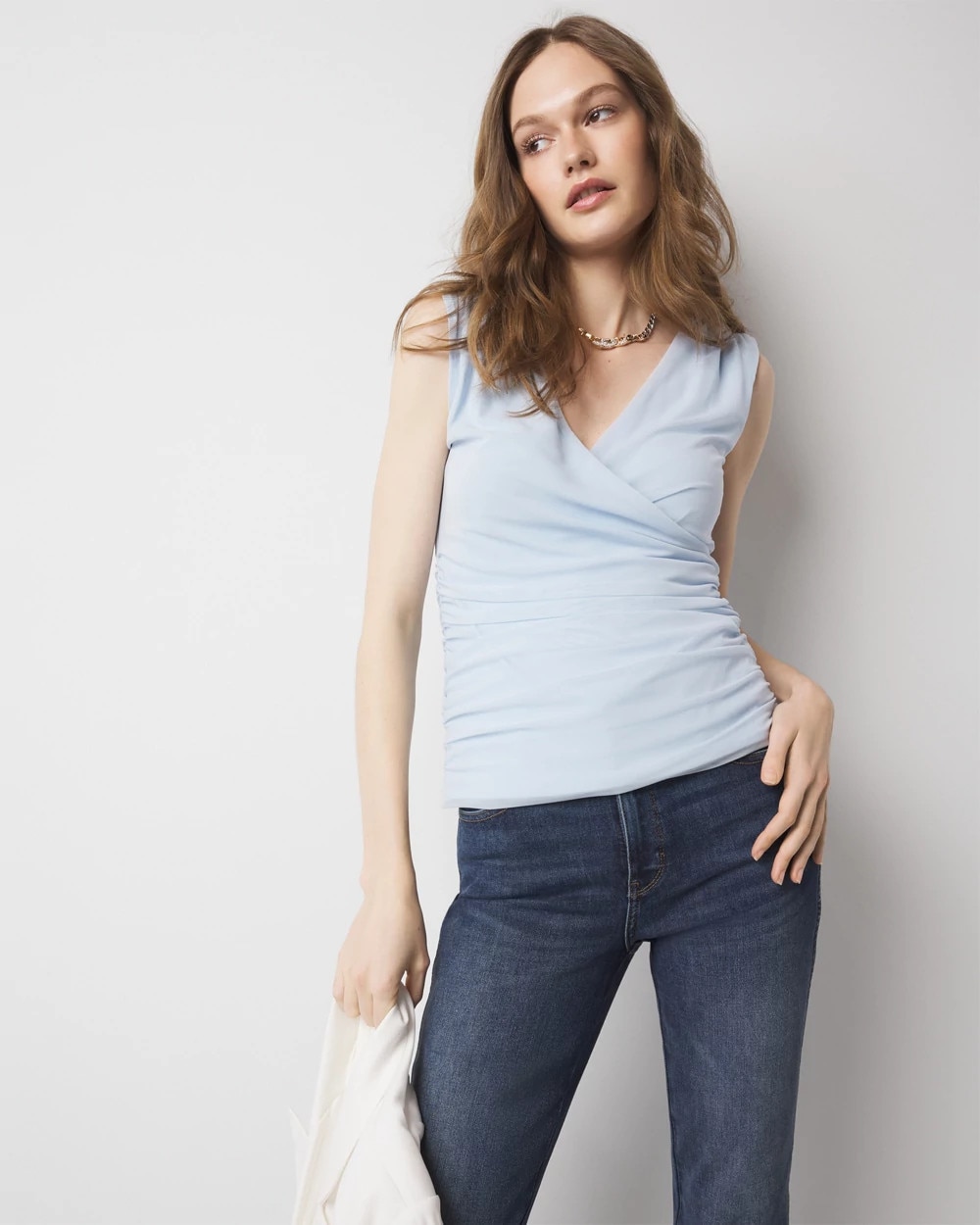 This feminine surplice top is designed with double layered mesh so it’s not see-through. The shirring at the side seams creates a fitted silhouette that will look fab with jeans or pants. Add a blazer at the office or a jean jacket for after work hours.