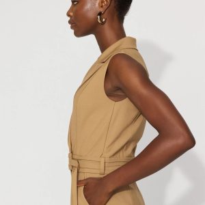 Your work wardrobe needs this blazer inspired tailored jumpsuit. We’ve added a pleated waist band and self-belt, as well princess seams in front, and back darts to shape you, creating a polished one-and-done outfit.