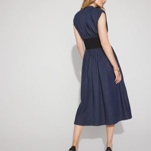 Made from Tencel with a built-in contrasting wide belt and double buckles, it also has cap sleeves for a polished look. Front button placket and pockets as well as elastic at the waist make this day dress an easy choice for work or play.
