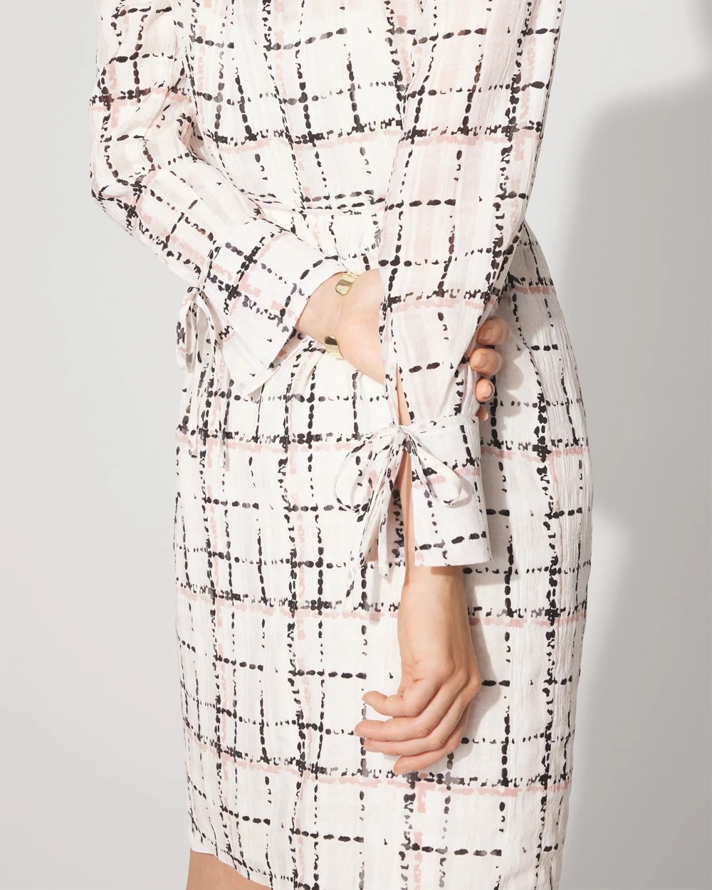 This chiffon shirt dress is an elevated look that’s perfect for the office. The cuffs have self-ties that can be undone to create a flounce effect, and the wrap waist has a self-tie along with a classic shirt button closure.