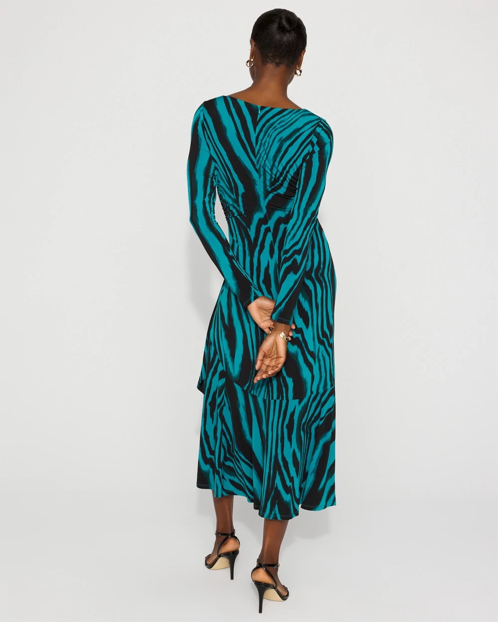 A functional side tie and ruching shapes this long-sleeve midi dress that will take you from desk to dinner.