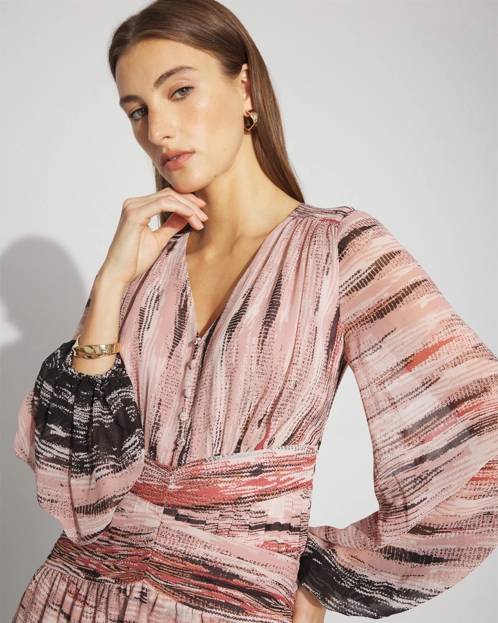 In a multi-colored print inspired by Italian designers, this timeless short dress has a waistband detail that defines you, while sheer sleeves and a pleated skirt add polish. Non-functioning covered buttons and elastic cuffs finish the look.