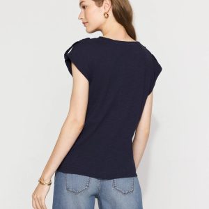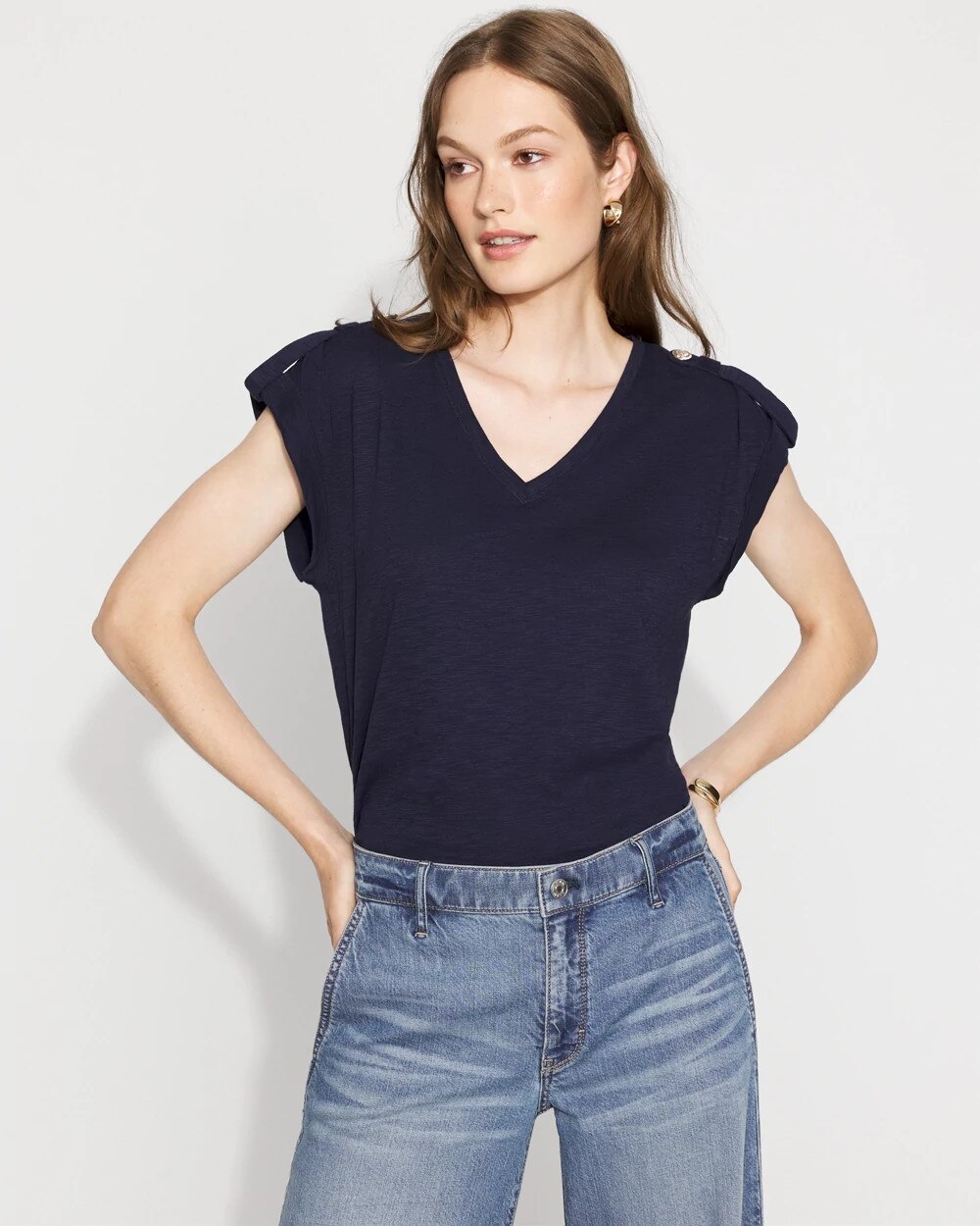 We updated a classic V-neck tee with epaulets on each shoulder for military flair, and added a soft gold crest button. Perfect to dress up your jeans or shorts.