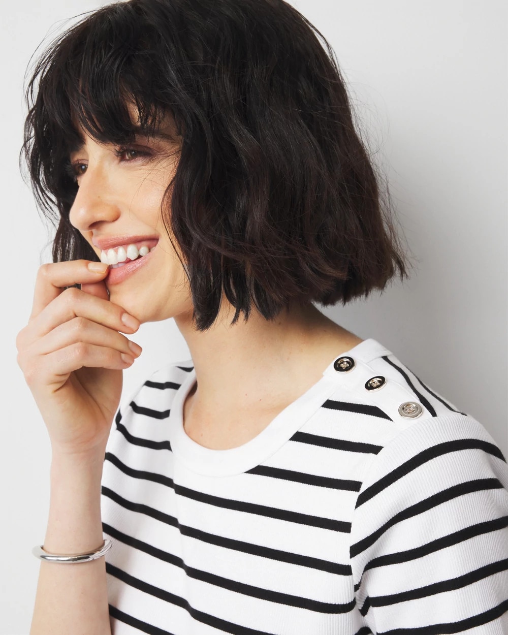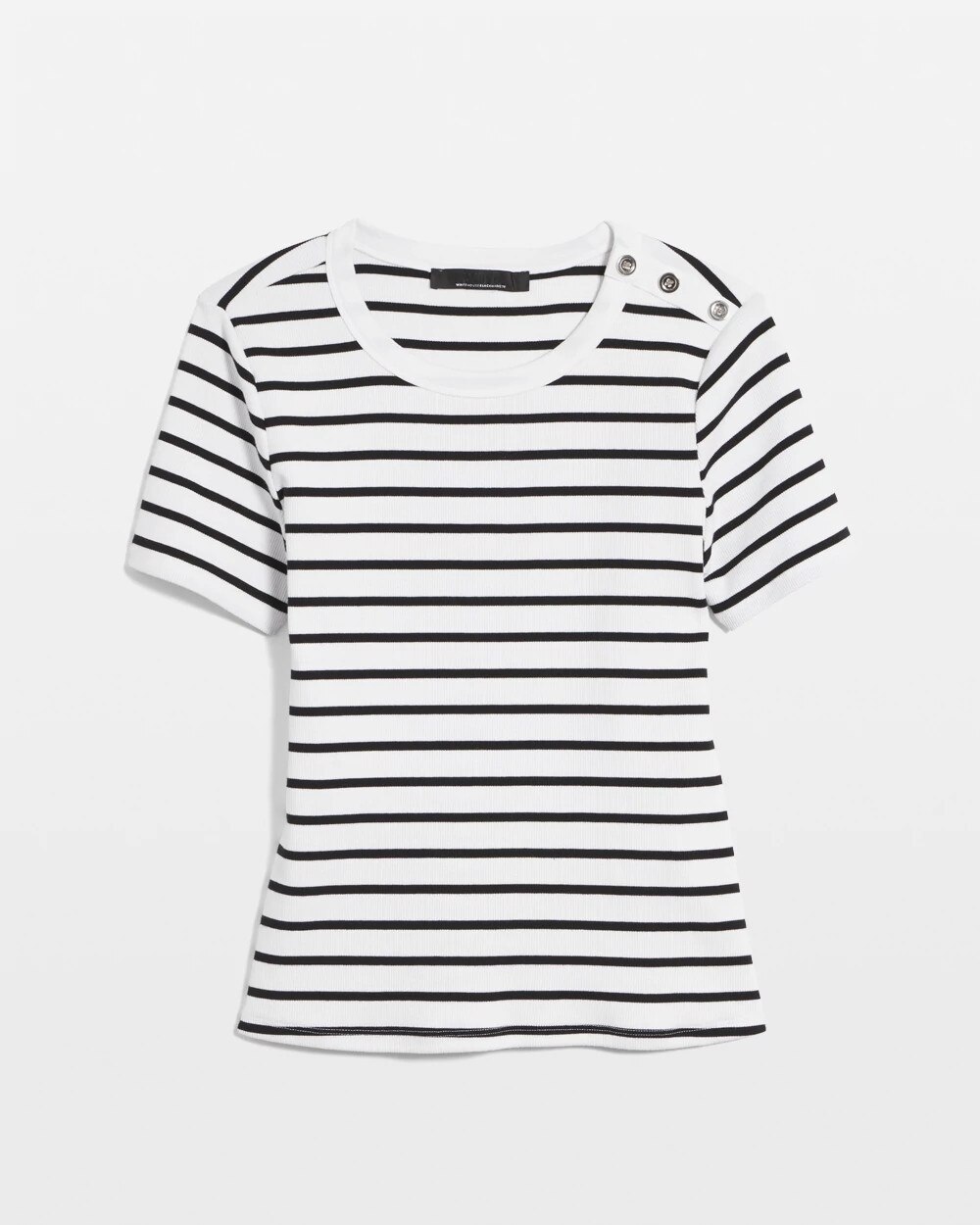 Part of our WHBM FORME™ Ribbed Stretch line-up, this short sleeve tee has three gold-toned buttons at the left shoulder and a ribbed material, making it one to love through all seasons. The comfortable crew neckline perfectly frames your face and collarbone. Wear it with denim and tailored trousers. Our ribbed fabric stretches and smooths your body, offering a flattering silhouette.