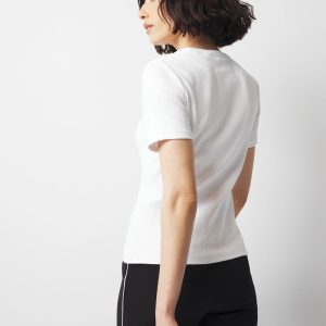 Part of our WHBM FORME™ Ribbed Stretch line-up, this short sleeve tee has three gold-toned buttons at the left shoulder and a ribbed material, making it one to love through all seasons. The comfortable crew neckline perfectly frames your face and collarbone. Wear it with denim and tailored trousers. Our ribbed fabric stretches and smooths your body, offering a flattering silhouette.