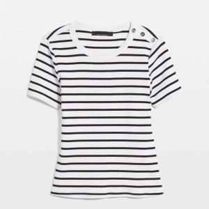 Part of our WHBM FORME™ Ribbed Stretch line-up, this short sleeve tee has three gold-toned buttons at the left shoulder and a ribbed material, making it one to love through all seasons. The comfortable crew neckline perfectly frames your face and collarbone. Wear it with denim and tailored trousers. Our ribbed fabric stretches and smooths your body, offering a flattering silhouette.