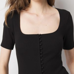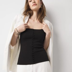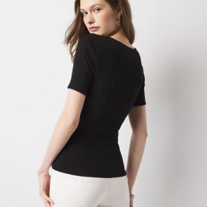 A new addition to WHBM FORME™ line-up, this short-sleeve tee has fully functional center front buttons and a flattering square scoop neckline. Our WHBM FORME™ ribbed fabric stretches and smooths your body, offering a flattering silhouette.