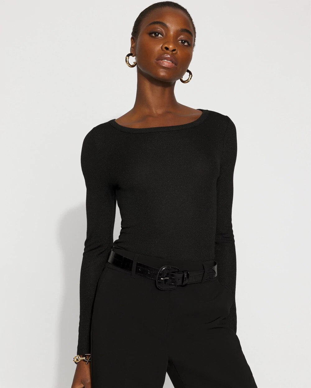 This long-sleeve tee is a great layering piece for under a jacket. Made from WHBM FORME™ Ribbed Stretch fabric, that stretches and smooths your body, offering a flattering silhouette, it also has a metallic shine to elevate the look.