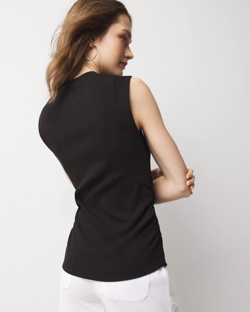 WHBM FORME™ Ribbed Stretch fabric stretches and smooths your body, offering a flattering silhouette. What also makes this crewneck tank stand apart is the ruching down the sides which gives it a hit of unexpected style. It’s finished with wide ribbed trim on neck and armholes. Wear it alone or layered under a jacket (but leave it unbuttoned so the ruching is visible.)