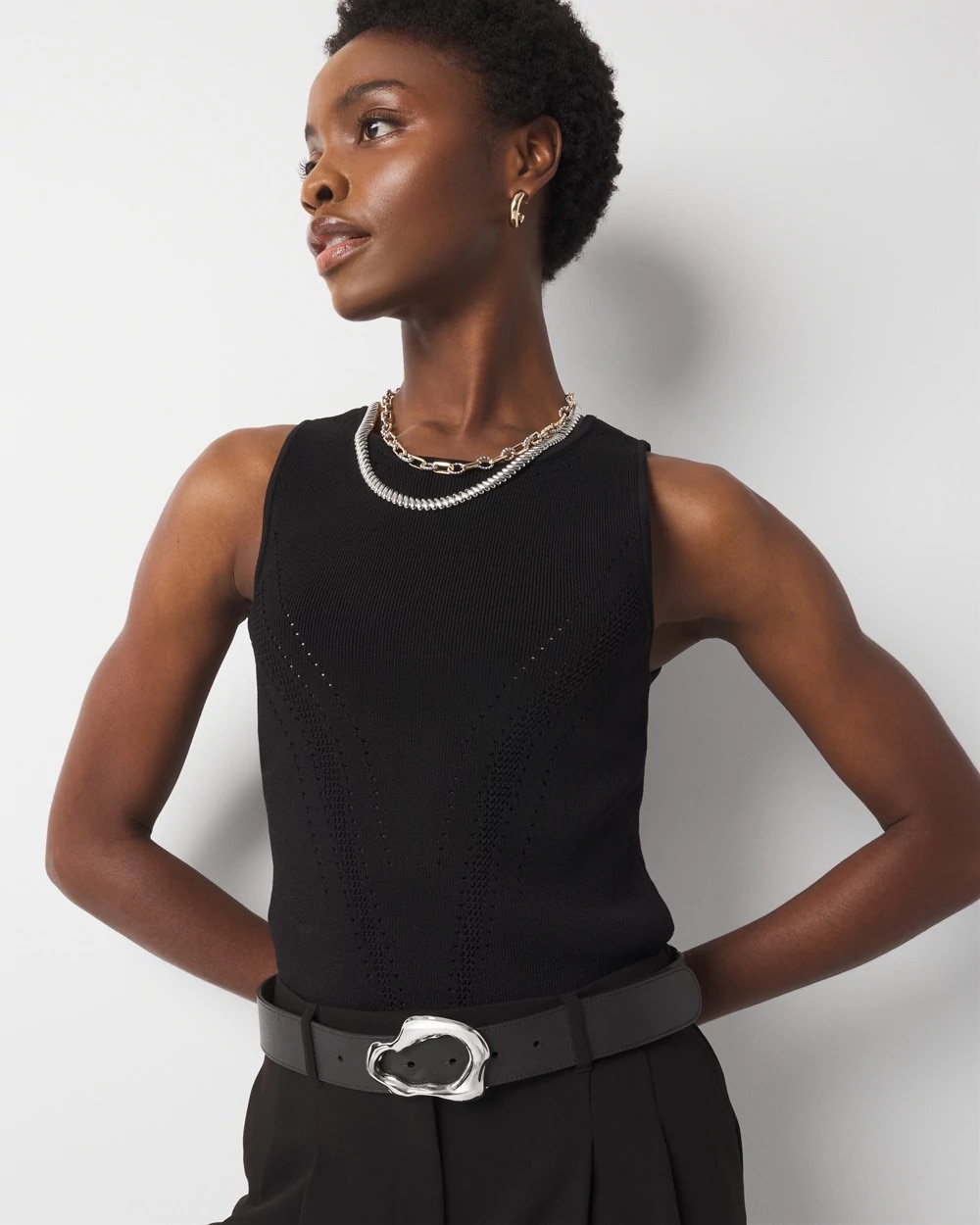 Our WHBM FORME™ Sculpt Stretch sweater tank has variegated pointelle stitch details that flatters your shape as well as a ribbed bottom. Sculpt stretch fabric gives you an unparalleled fit that conforms closely to the body and lets you move comfortably. Wear under a jacket on cool days or under a blazer for the office.