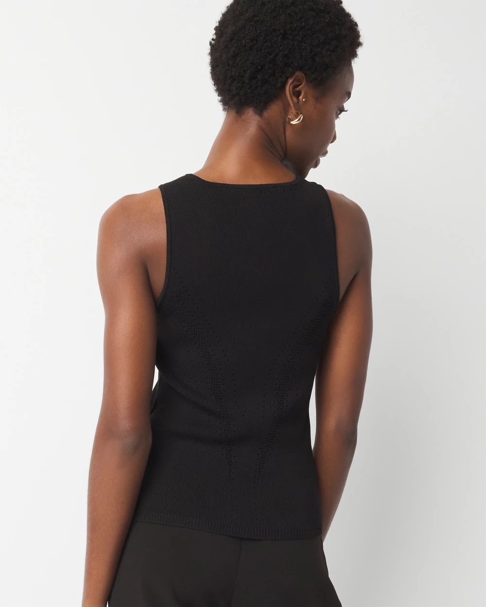 Our WHBM FORME™ Sculpt Stretch sweater tank has variegated pointelle stitch details that flatters your shape as well as a ribbed bottom. Sculpt stretch fabric gives you an unparalleled fit that conforms closely to the body and lets you move comfortably. Wear under a jacket on cool days or under a blazer for the office.
