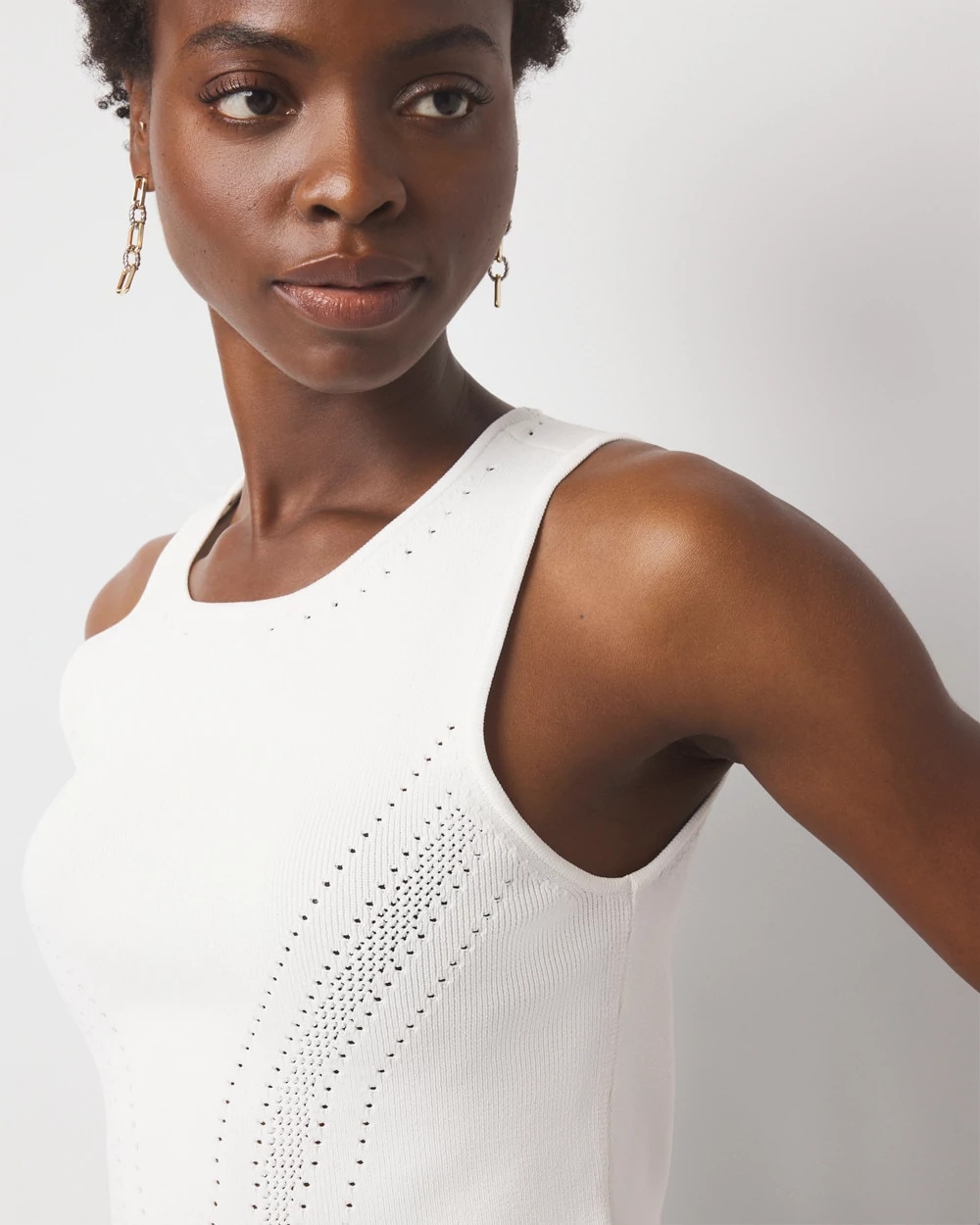 Our WHBM FORME™ Sculpt Stretch sweater tank has variegated pointelle stitch details that flatters your shape as well as a ribbed bottom. Sculpt stretch fabric gives you an unparalleled fit that conforms closely to the body and lets you move comfortably. Wear under a jacket on cool days or under a blazer for the office.