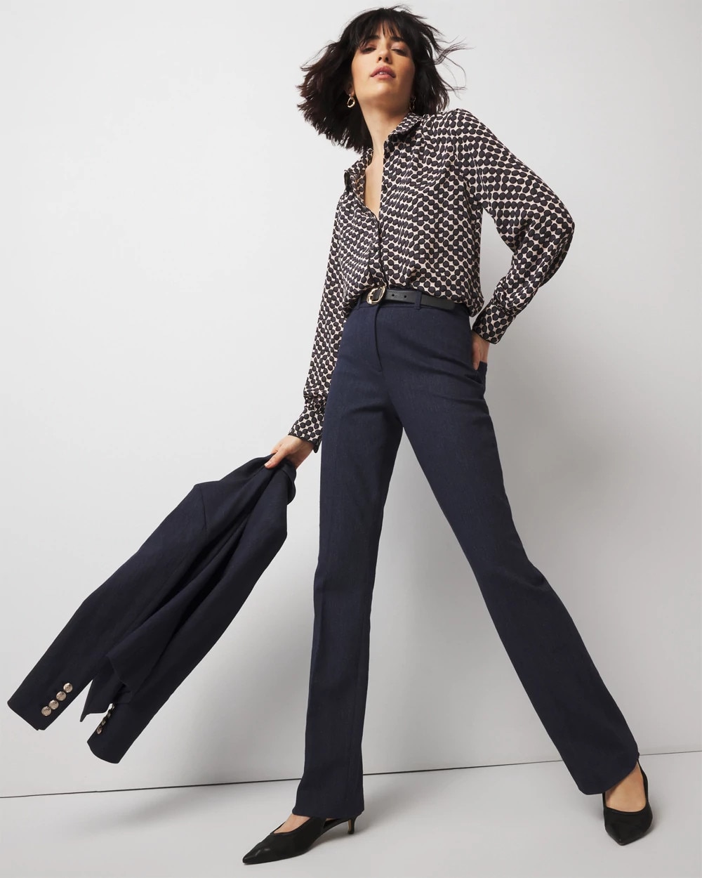 The WHBM® Ines Bootcut you love is updated in this denim look fabric. It still has the slim fit with a slight flare at the bottom to create a flattering silhouette that works with heels or boots (naturally)!