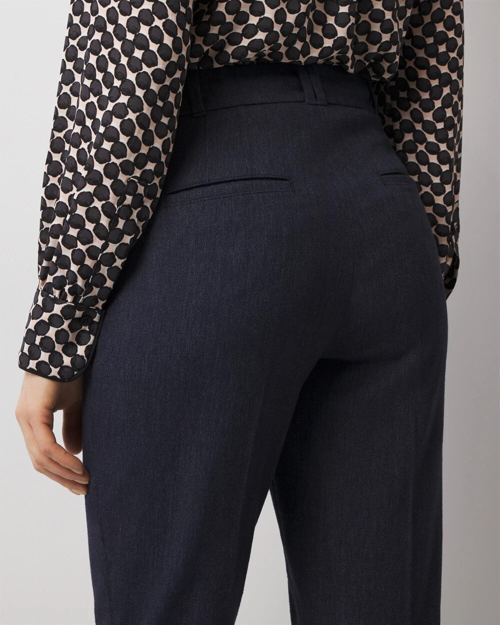 The WHBM® Ines Bootcut you love is updated in this denim look fabric. It still has the slim fit with a slight flare at the bottom to create a flattering silhouette that works with heels or boots (naturally)!