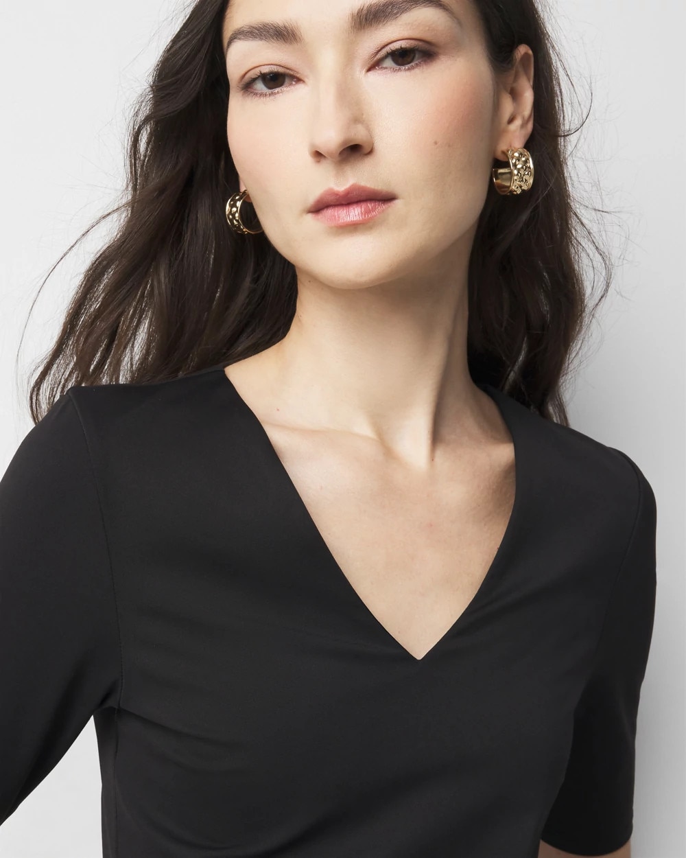 Our collection of WHBMFORME™ All Ways Stretch fashion tees provide flexibility and movement with a fabric that stretches in all directions. This classic V-neck tee with elbow sleeves will quickly become your go-to top this spring.